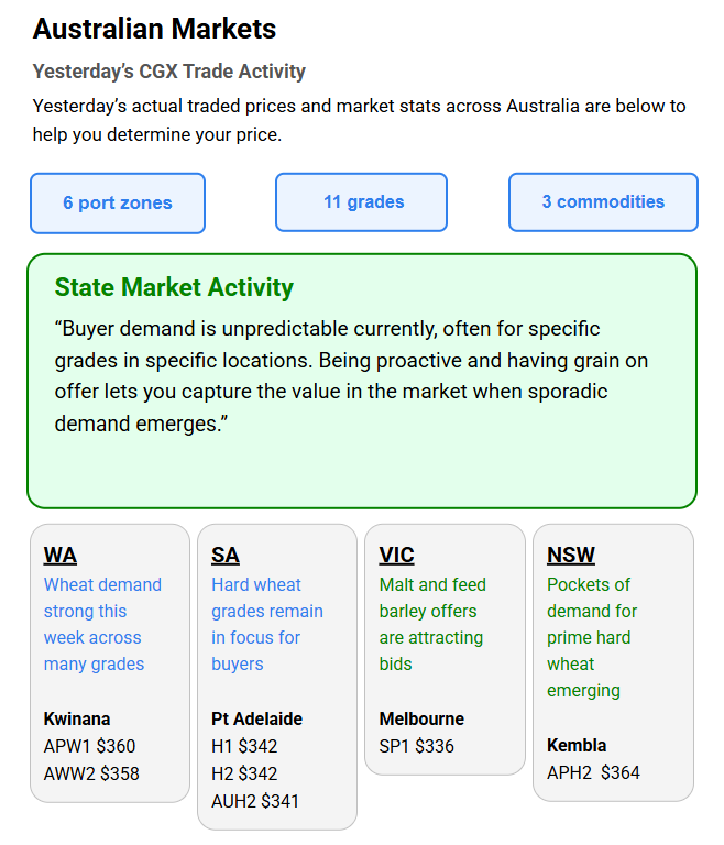 Australia’s independent grain report—designed to help support your pricing decisions before the market opens at 10:00am AEST. If you need to change your offer price, simply edit it before market open.