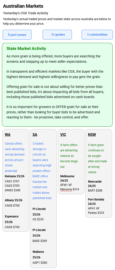Australia’s independent grain report—designed to help support your pricing decisions before the market opens at 10:00am AEST. If you need to change your offer price, simply edit it before market open.