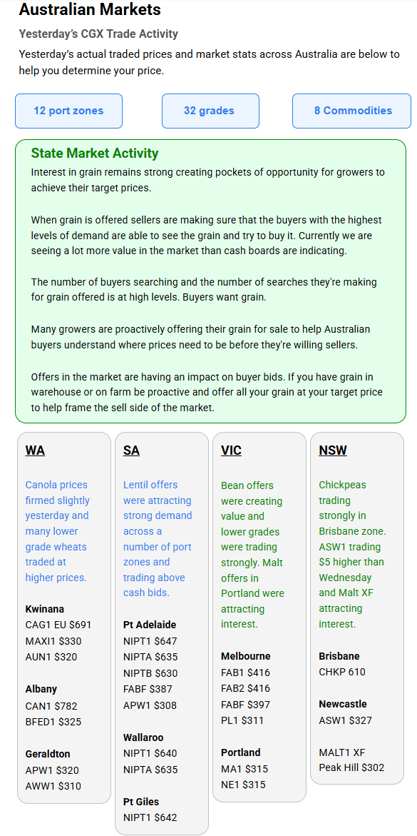 Australia’s independent grain report—designed to help support your pricing decisions before the market opens at 10:00am AEST. If you need to change your offer price, simply edit it before market open.