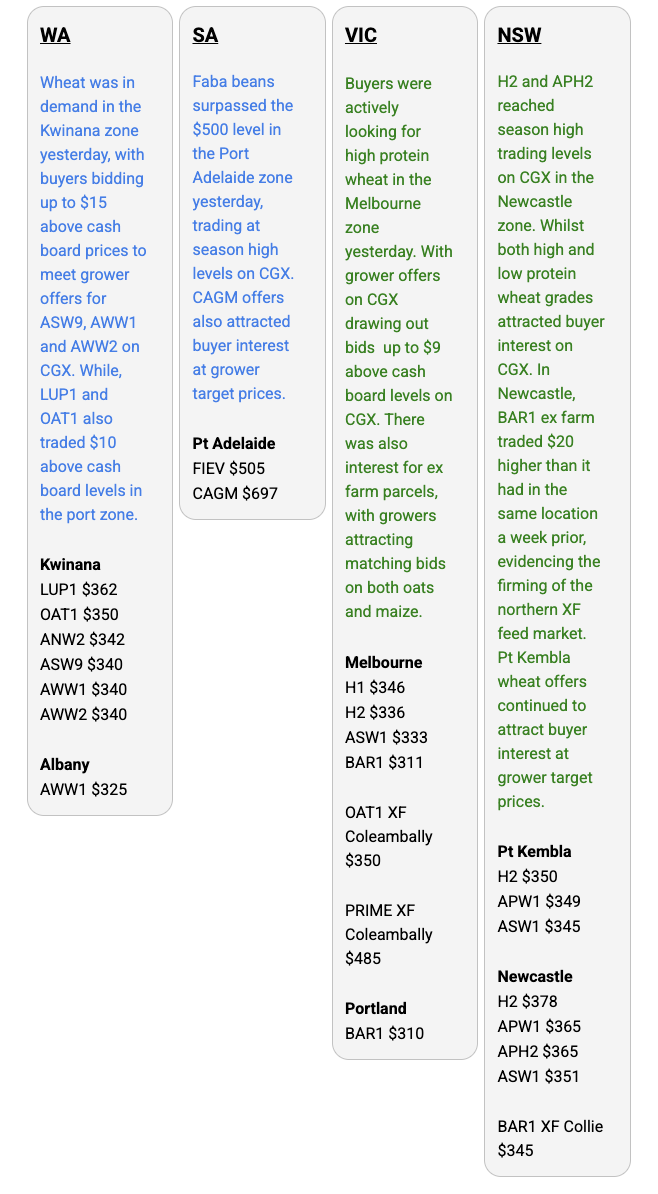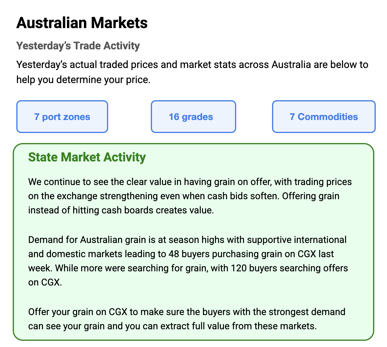 Australia’s independent grain report—designed to help support your pricing decisions before the market opens at 10:00am AEST. If you need to change your offer price, simply edit it before market open.