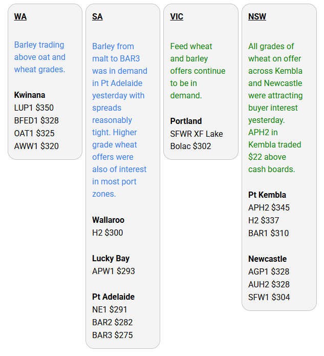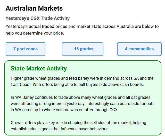 Australia’s independent grain report—designed to help support your pricing decisions before the market opens at 10:00am AEST. If you need to change your offer price, simply edit it before market open.