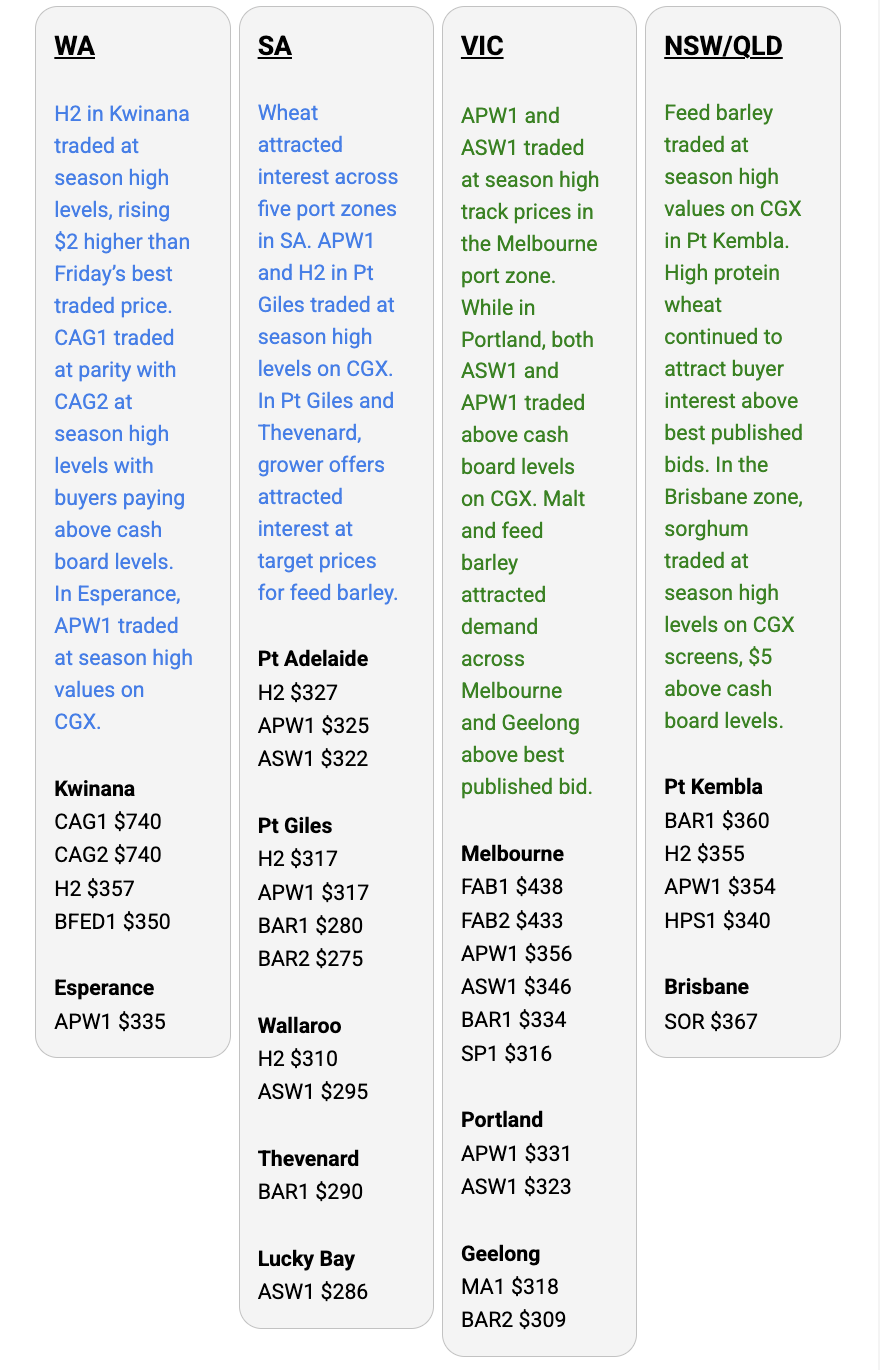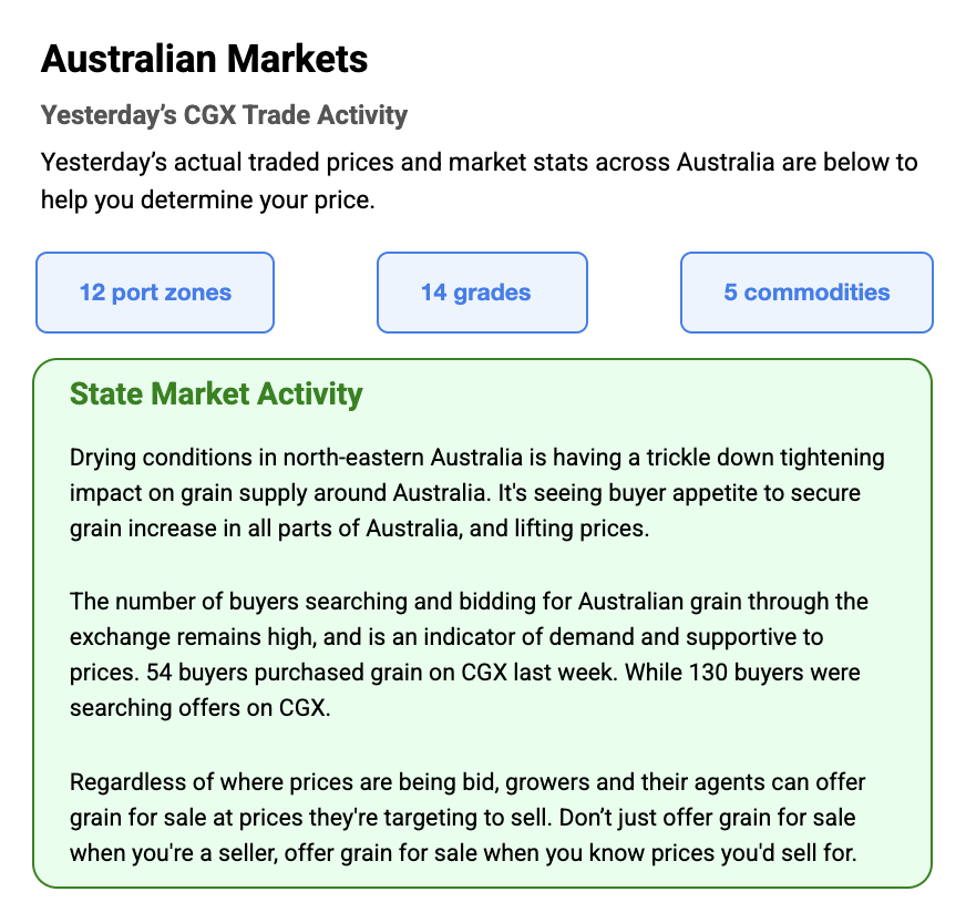 Australia’s independent grain report—designed to help support your pricing decisions before the market opens at 10:00am AEST. If you need to change your offer price, simply edit it before market open.