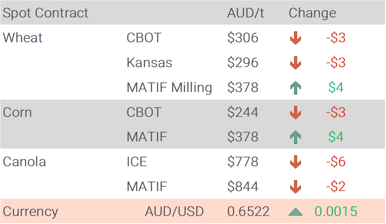 Domestic wheat and barley bids have firmed a couple of dollars on little bit of buying interest and slow grower selling. The sorghum market lifted a touch as the trade paid up to finish off some of their packing and bulk export programs. The new crop chickpea market has firmed on some renewed buying interest and slow grower selling.