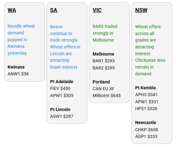 Australia’s independent grain report—designed to help support your pricing decisions before the market opens at 10:00am AEST. If you need to change your offer price, simply edit it before market open.