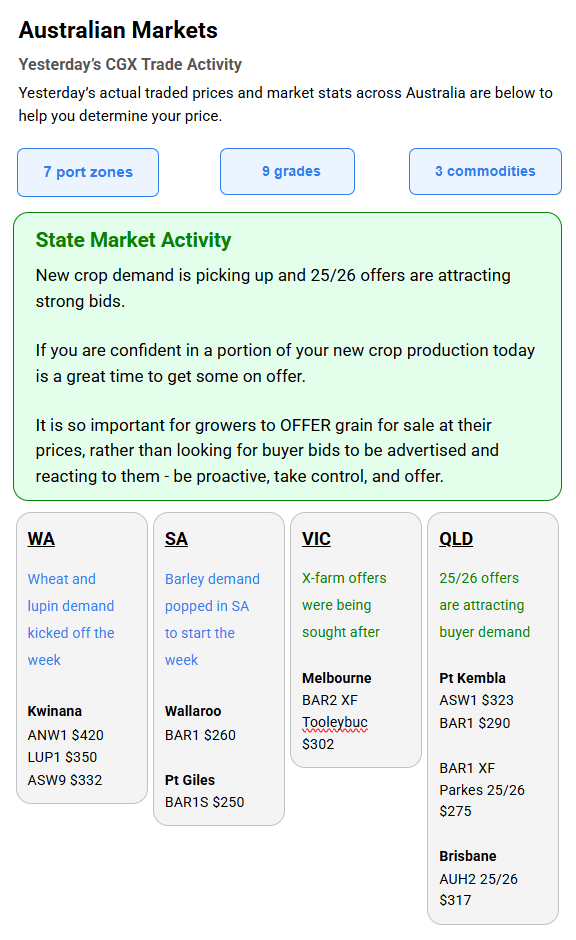 Australia’s independent grain report—designed to help support your pricing decisions before the market opens at 10:00am AEST. If you need to change your offer price, simply edit it before market open.