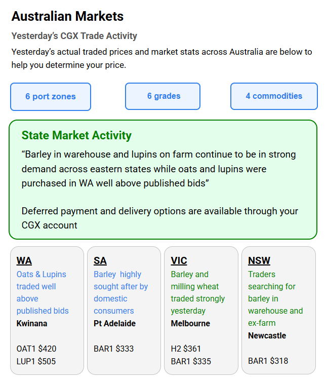 Australia’s independent grain report—designed to help support your pricing decisions before the market opens at 10:00am AEST. If you need to change your offer price, simply edit it before market open.