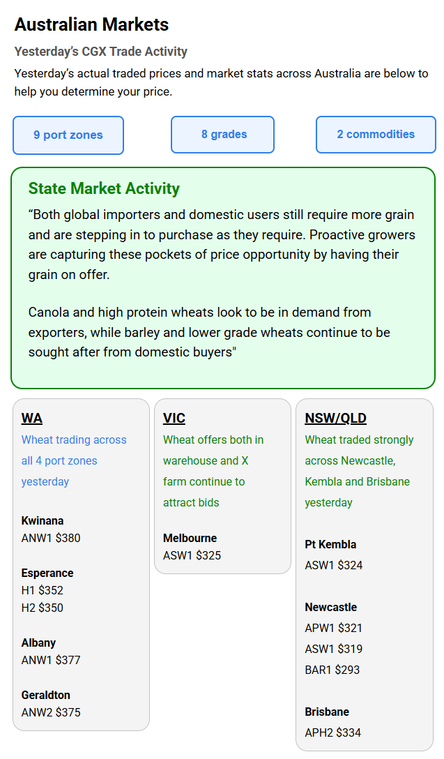 Australia’s independent grain report—designed to help support your pricing decisions before the market opens at 10:00am AEST. If you need to change your offer price, simply edit it before market open.