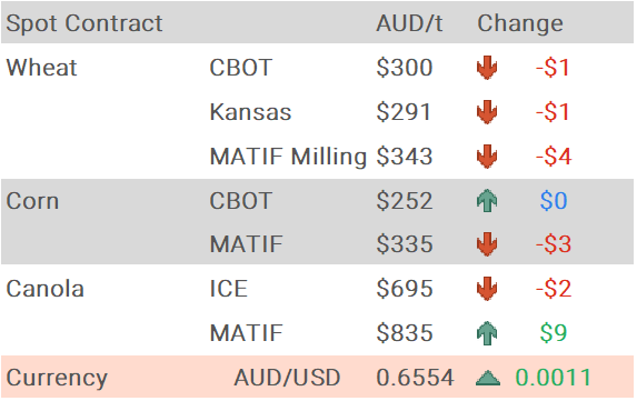 US markets were closed for Labor Day Holiday and the lead from European markets was weaker as futures made fresh contract lows on a stronger euro and falling prices in Russia which has dampened EU export hopes. Increased ABARES forecast of Australia's harvest underscored plentiful global supply.