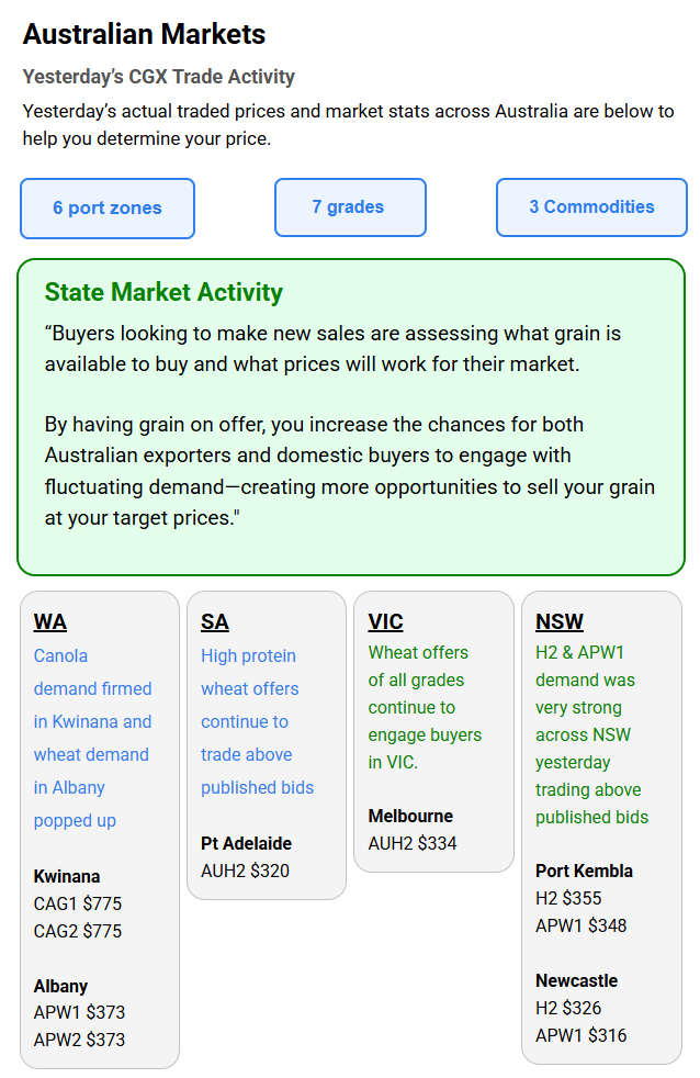 Australia’s independent grain report—designed to help support your pricing decisions before the market opens at 10:00am AEST. If you need to change your offer price, simply edit it before market open.