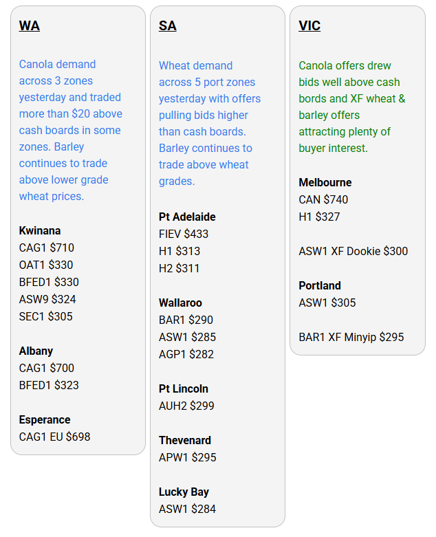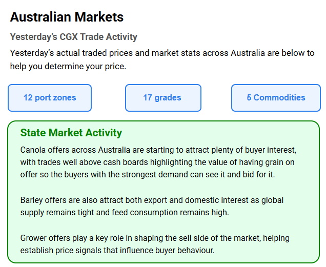 Australia’s independent grain report—designed to help support your pricing decisions before the market opens at 10:00am AEST. If you need to change your offer price, simply edit it before market open.