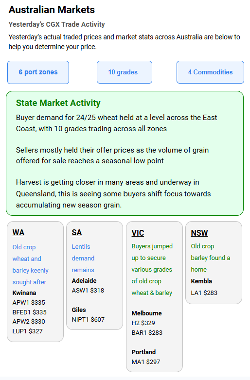 Australia’s independent grain report—designed to help support your pricing decisions before the market opens at 10:00am AEST. If you need to change your offer price, simply edit it before market open.