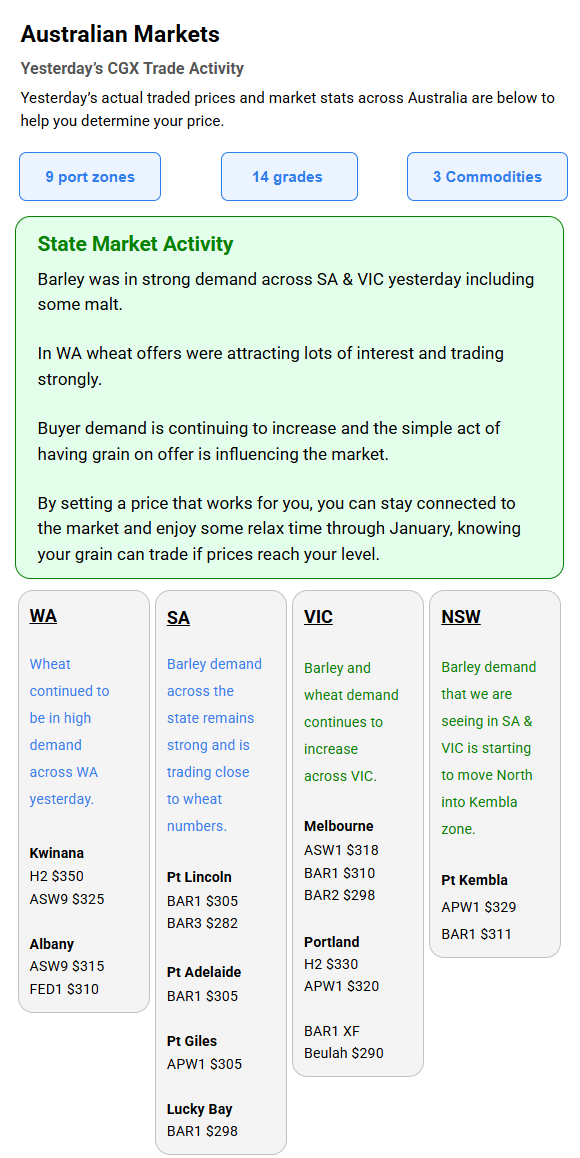 Australia’s independent grain report—designed to help support your pricing decisions before the market opens at 10:00am AEST. If you need to change your offer price, simply edit it before market open.