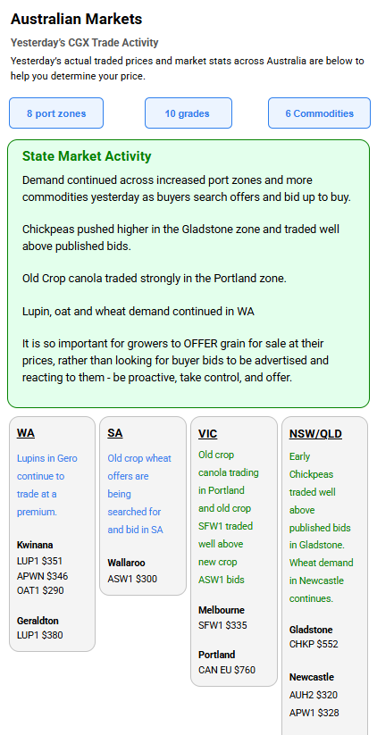 Australia’s independent grain report—designed to help support your pricing decisions before the market opens at 10:00am AEST. If you need to change your offer price, simply edit it before market open.
