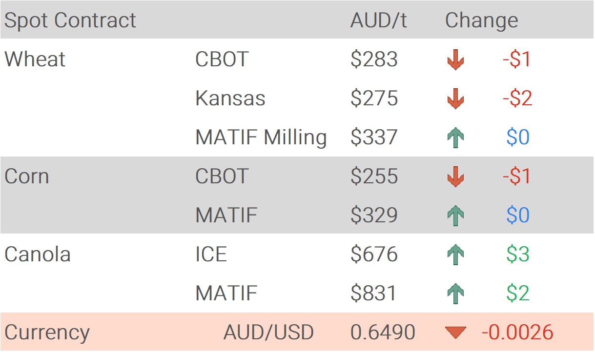 Nothing overnight to change local markets. Can’t see southern markets giving up their premiums until we get closer to harvest. In the north, most prompt homes have been satisfied by early harvest and growers are comfortable storing and optimising harvest logistics. There is likely to be competition from bulk handlers/grain logistics companies trying to attract some volume into their systems so they can turn a dollar on their grain handling infrastructure in the absence of a trading margin. Most end users have limited forward coverage and will continue to buy hand to mouth until something changes fundamentally in the S&D.