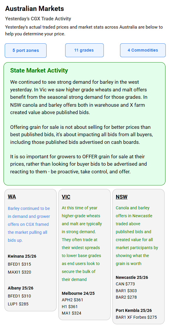 Australia’s independent grain report—designed to help support your pricing decisions before the market opens at 10:00am AEST. If you need to change your offer price, simply edit it before market open.