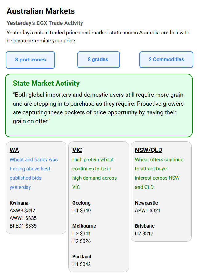 Australia’s independent grain report—designed to help support your pricing decisions before the market opens at 10:00am AEST. If you need to change your offer price, simply edit it before market open.