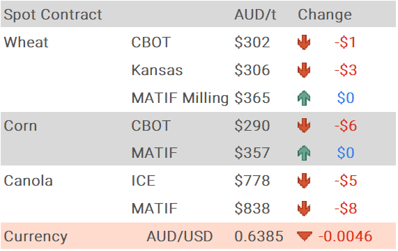 US grain markets were under heavy selling pressure last night as the weather risk premium came out of markets. Rain across key wheat growing regions of the northern hemisphere has improved winter wheat conditions while corn and soybean markets also were pressured from favourable crop weather in SAM.