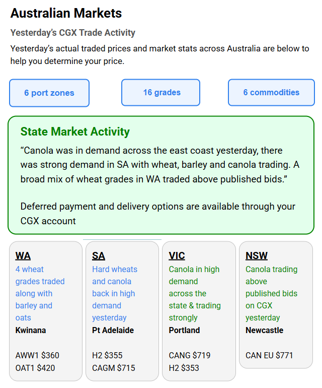 Australia’s independent grain report—designed to help support your pricing decisions before the market opens at 10:00am AEST. If you need to change your offer price, simply edit it before market open.