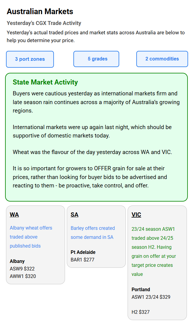 Australia’s independent grain report—designed to help support your pricing decisions before the market opens at 10:00am AEST. If you need to change your offer price, simply edit it before market open.