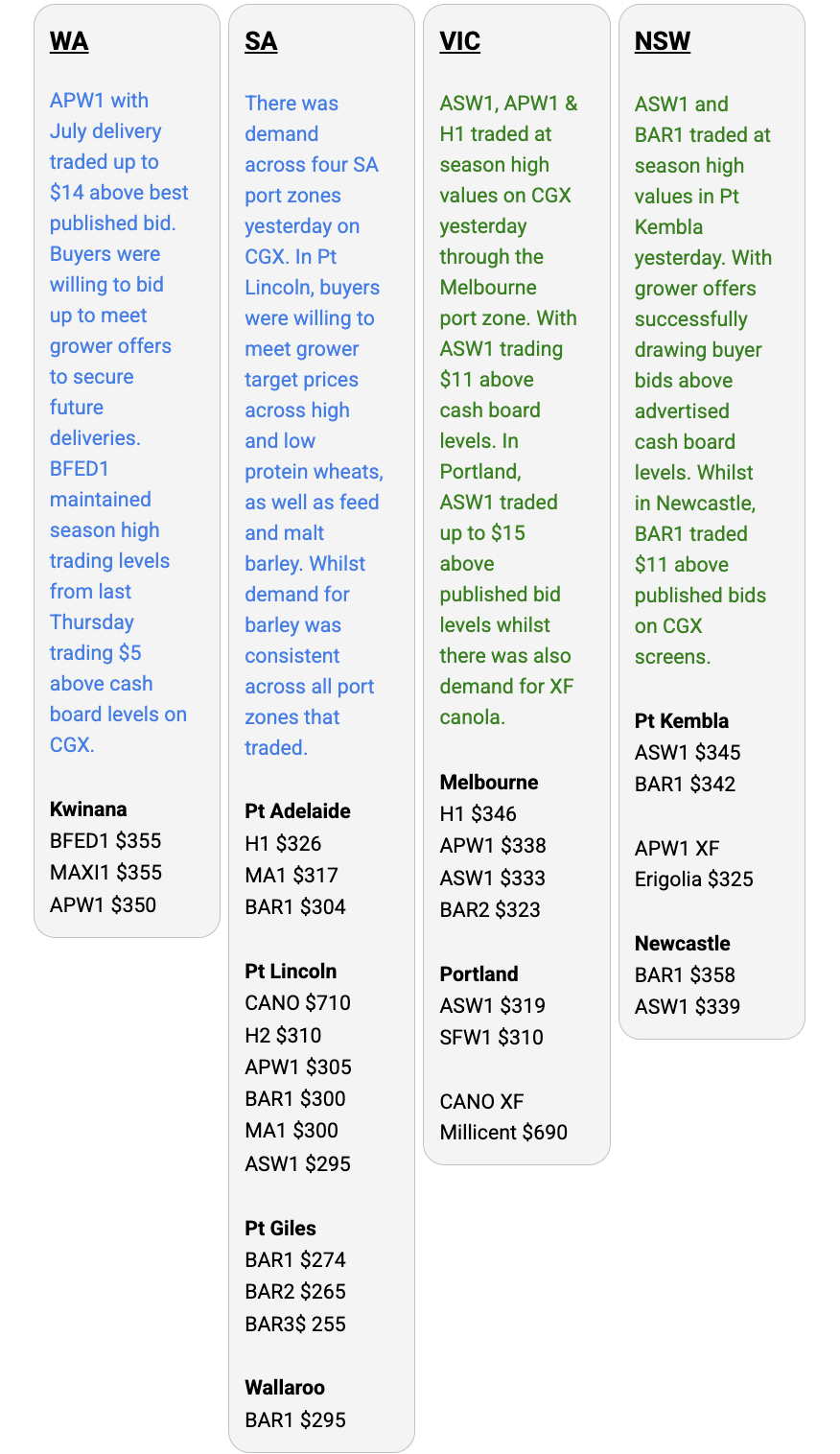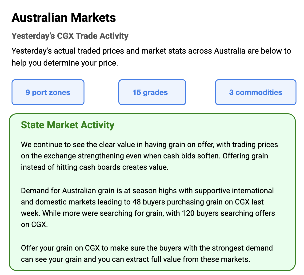 Australia’s independent grain report—designed to help support your pricing decisions before the market opens at 10:00am AEST. If you need to change your offer price, simply edit it before market open.