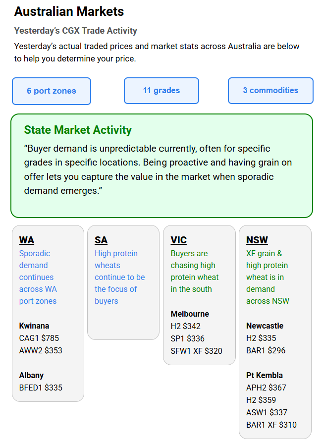 Australia’s independent grain report—designed to help support your pricing decisions before the market opens at 10:00am AEST. If you need to change your offer price, simply edit it before market open.