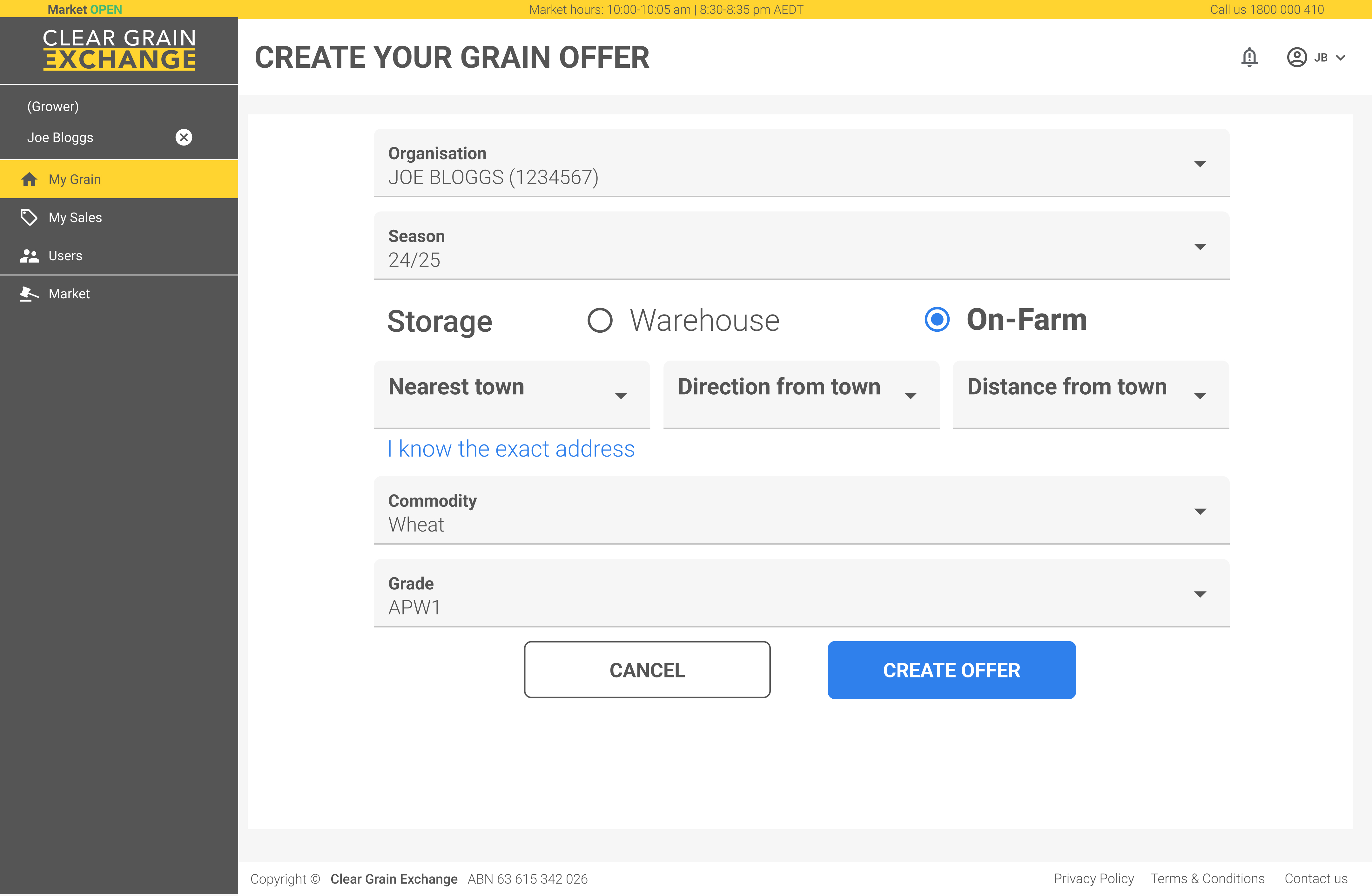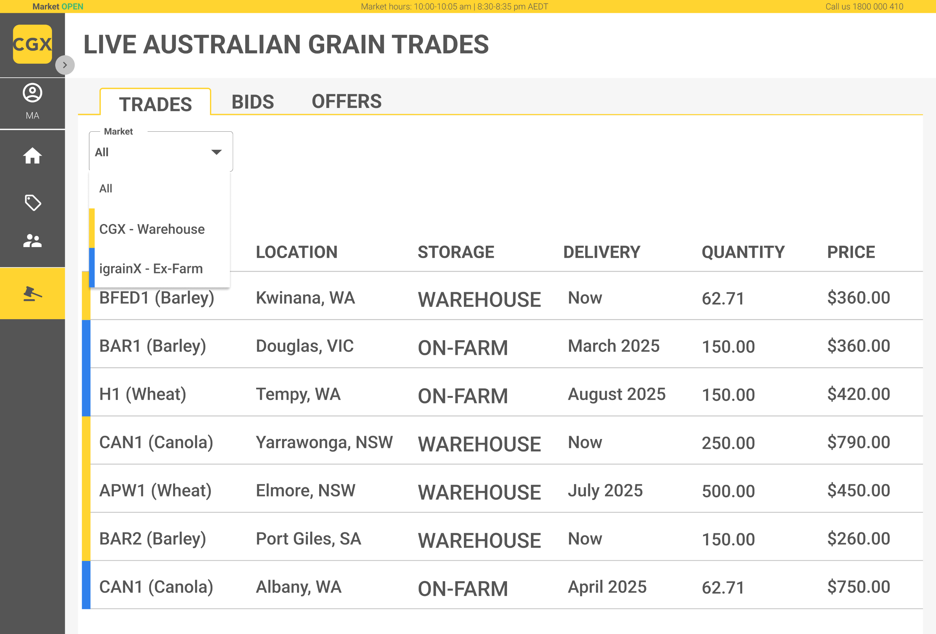 This is a fully integrated market inside CGX enabling you to offer ex-farm (XF) grain for sale to all buyers securely!