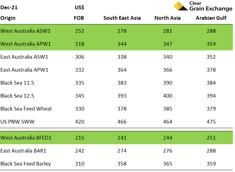 The table shows indicative wheat and barley values based on best published bids to growers this week plus fobbing costs and exchange rate conversion to provide a US$ Free on Board (FOB) price basis ex Western Australia and Eastern Australia and our major competitor origins of Black Sea and US Pacific Northwest.