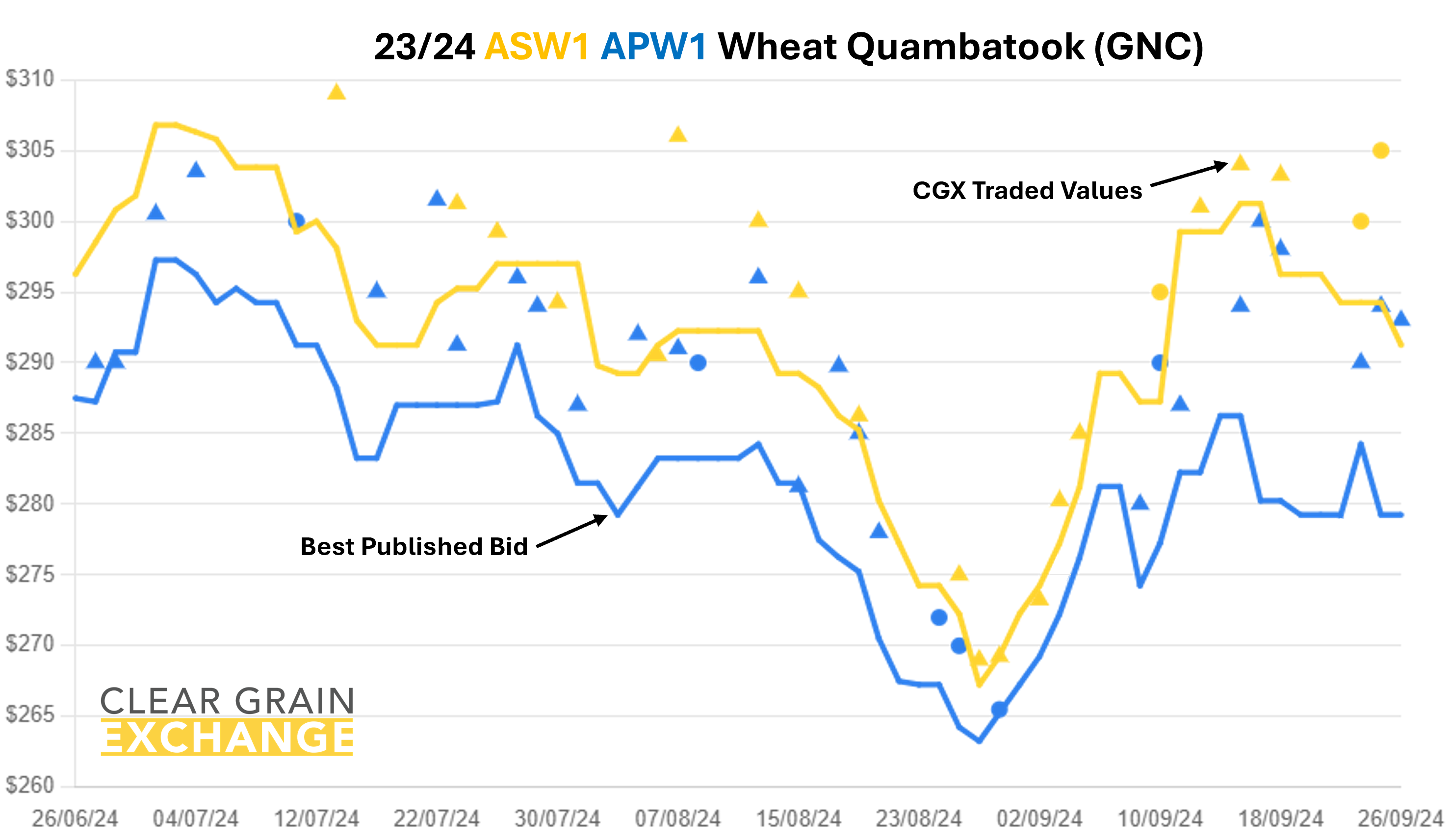 The below chart shows APW1 and ASW1 wheat Quambatook GNC trading at grower OFFER targets above best published bids.