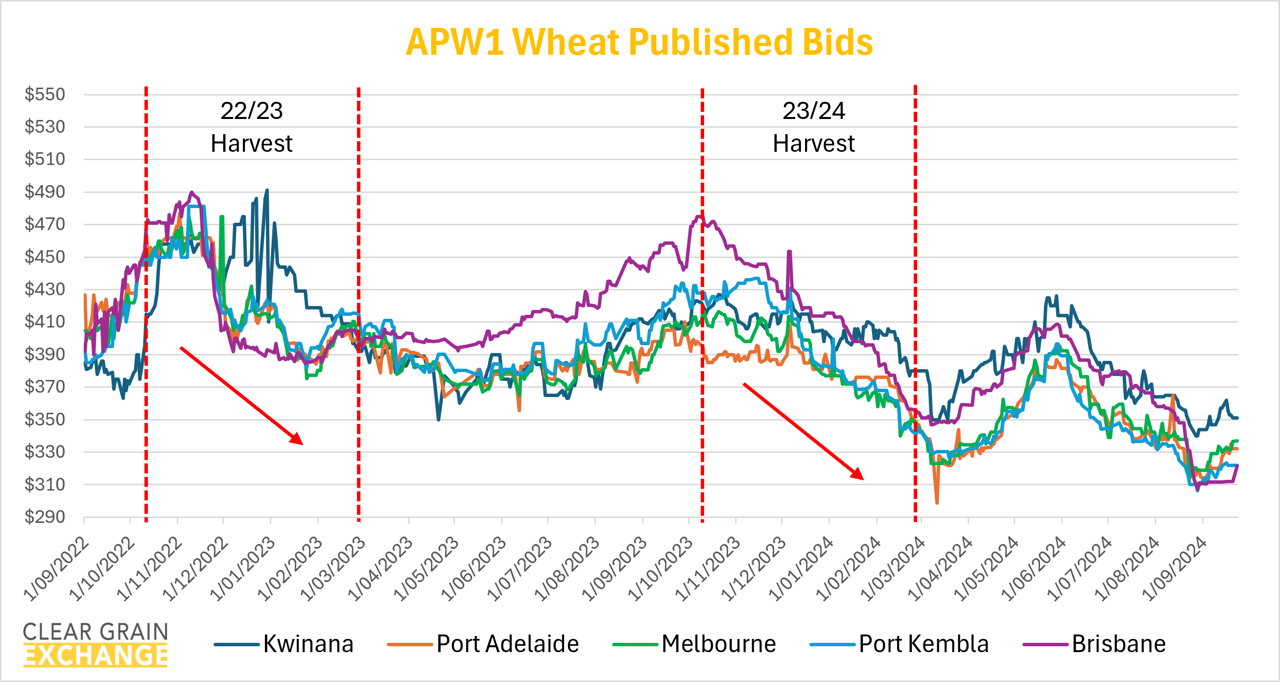 More grain is available, growers are selling, buyers pull bid prices back - this is often referred to as "harvest price pressure".