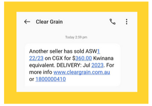 Growers with grain offered on Clear Grain Exchange will be familiar with the "Another seller" SMS notifications. The purpose of these notifications is to keep you informed of actual prices of the same grade in the same port zone so you can monitor and manage your offers as needed.