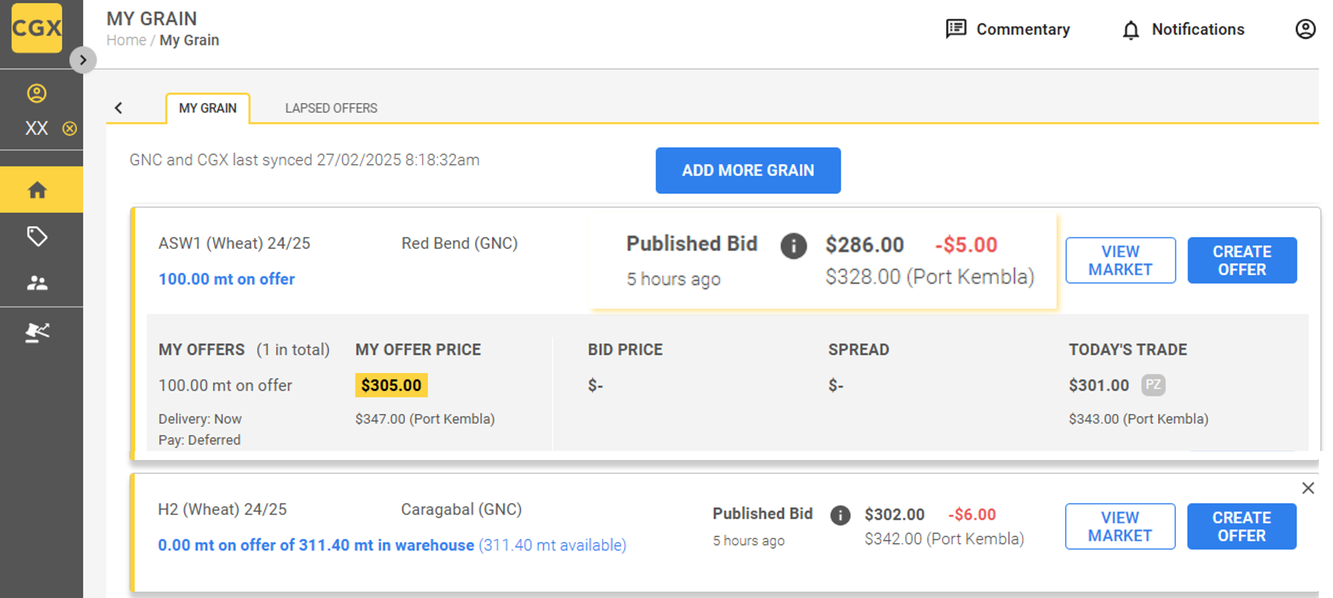 In your 'My Grain' tab you can view the 'Best Published Bid' and easily navigate to 'VIEW MARKET' to see traded prices for each of your warehoused grades.