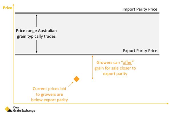 Australian grain values typically trade between export parity (export competitive price) and import parity (price required to import). However right now grain prices being bid to growers are well below export parity.