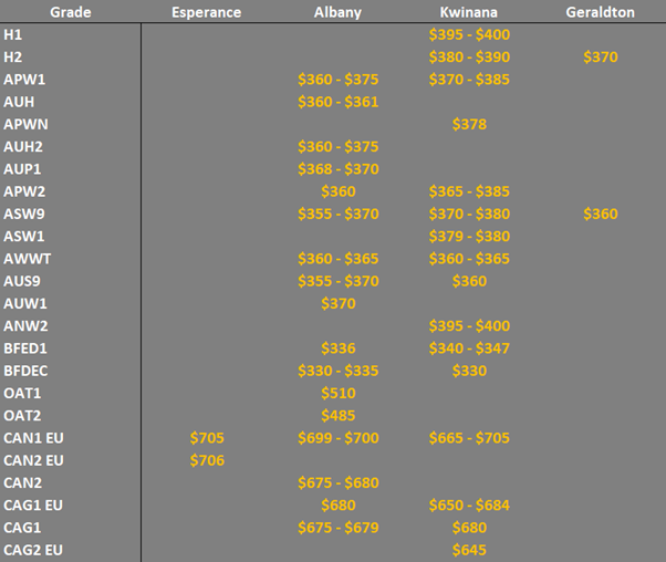 Note: GTA location differentials are used to convert prices to a port equivalent price, actual freight rates can differ particularly in the eastern states. You can offer any grade for sale to create demand.