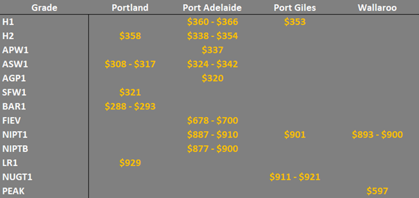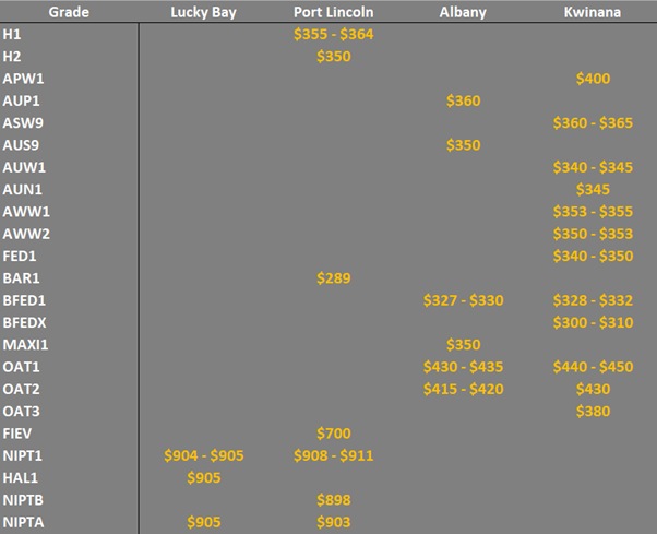Quality of the harvest has seen many grades of grain eventuate. Growers with downgraded and off-spec grades are actively offering those for sale at prices closer to ASW1 and yielding results. FED1 wheat in WA was trading $350/t as an example.