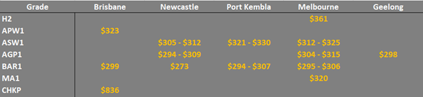 Note: GTA location differentials are used to convert prices to a port equivalent price, actual freight rates can differ particularly in the eastern states. You can offer any grade for sale to create demand.