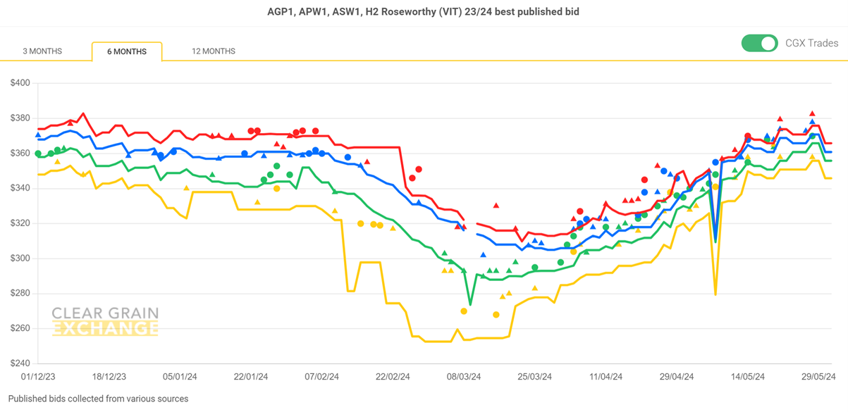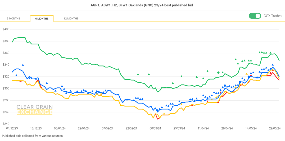 Lower grade AGP1 wheat was trading $390/t Pt Kembla, $370/t Pt Adelaide, and $366/t Melbourne as examples, while noodle wheat was trading $500/t in the west.
