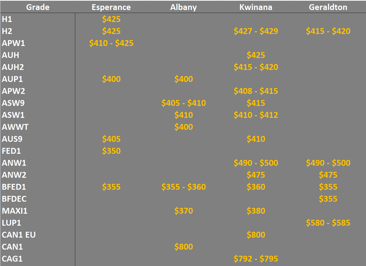 APW1 wheat traded $425/t in Esperance, $391/t Pt Kembla, $390/t Pt Adelaide, and $386/t Melbourne. ASW1 wheat was trading $412/t Kwinana, $390/t Pt Kembla, $382/t Pt Adelaide, and $374/t Portland.