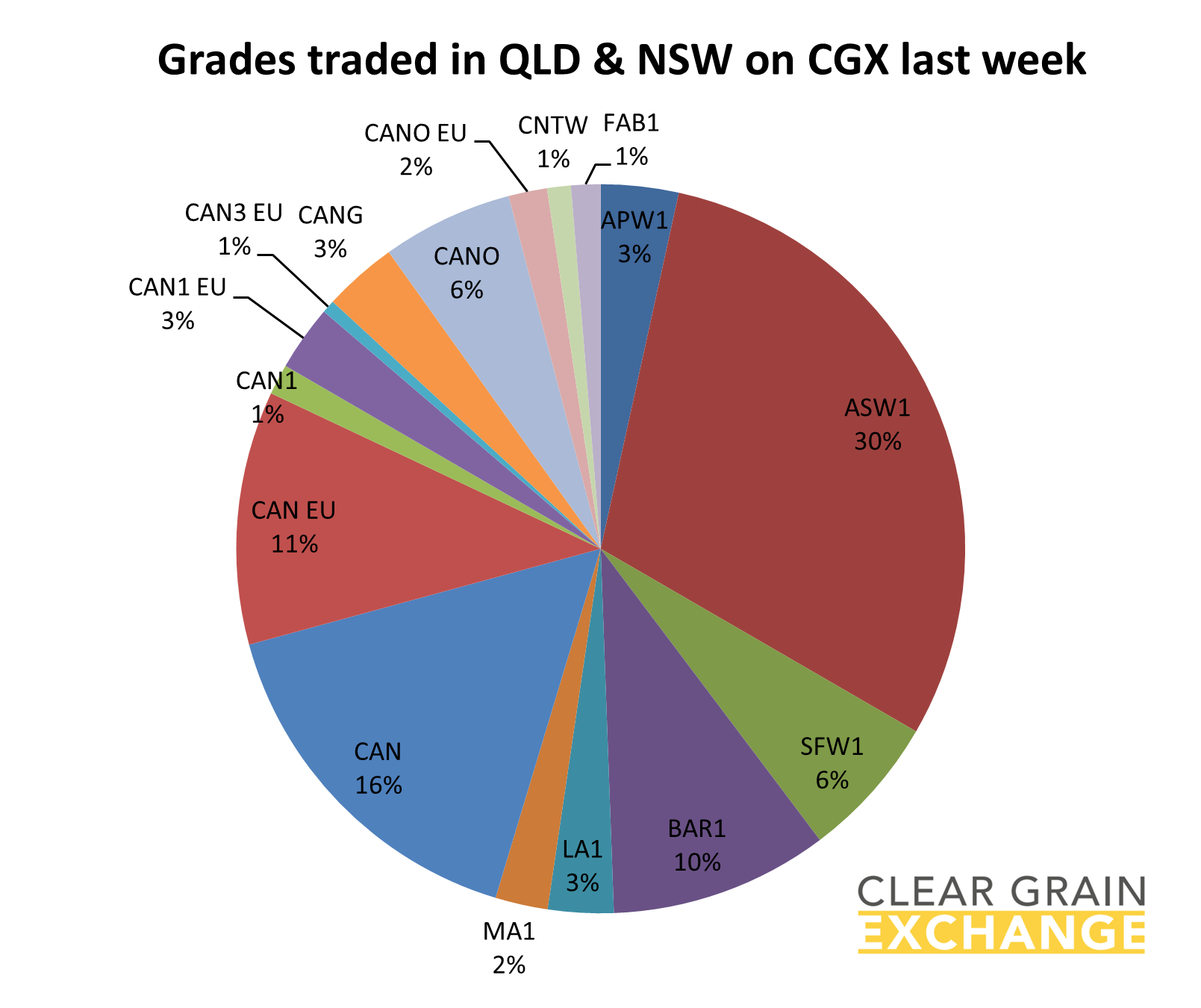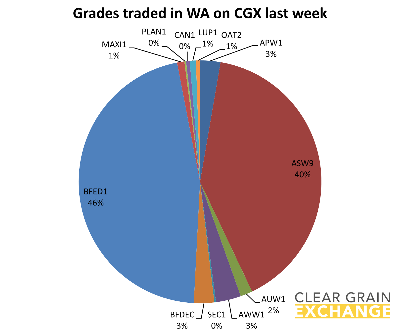 10 grades of wheat traded to make up 41% of all grain sold through CGX and igrainX last week with ASW1 trading $364/t Pt Kembla track and ASW9 trading $365/t Kwinana as price indicators.