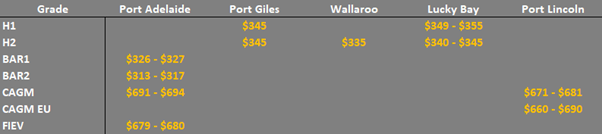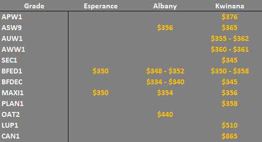Note: GTA location differentials are used to convert prices to a port equivalent price, actual freight rates can differ particularly in the eastern states. You can offer any grade for sale to create demand.