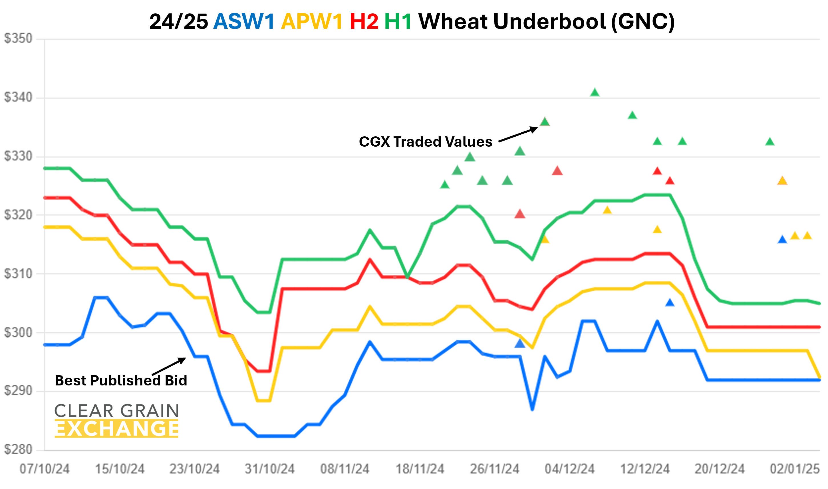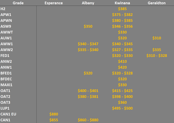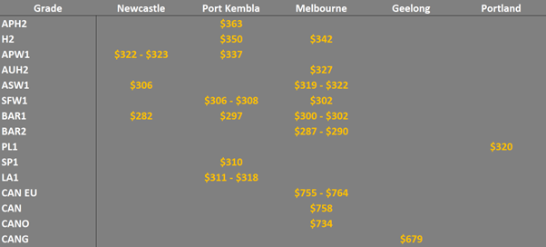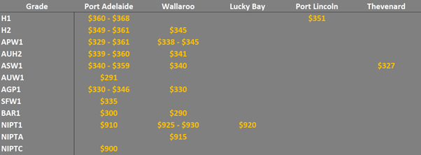 Note: GTA location differentials are used to convert prices to a port equivalent price, actual freight rates can differ particularly in the eastern states. You can offer any grade for sale to create demand.