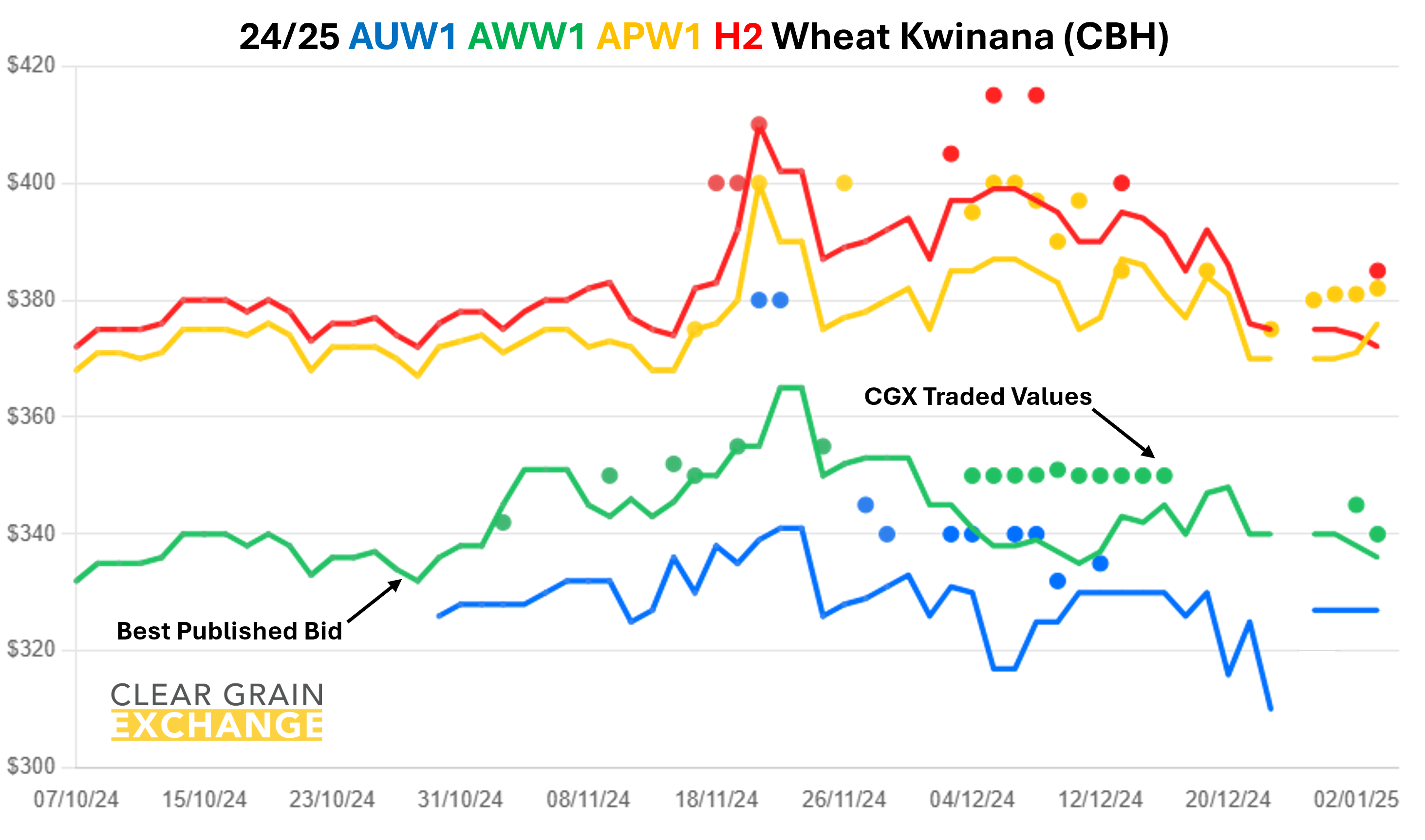 Many published bids for grades of grain pulled back in the week leading up to Christmas as there was evidence of significant grower selling into cash bids.