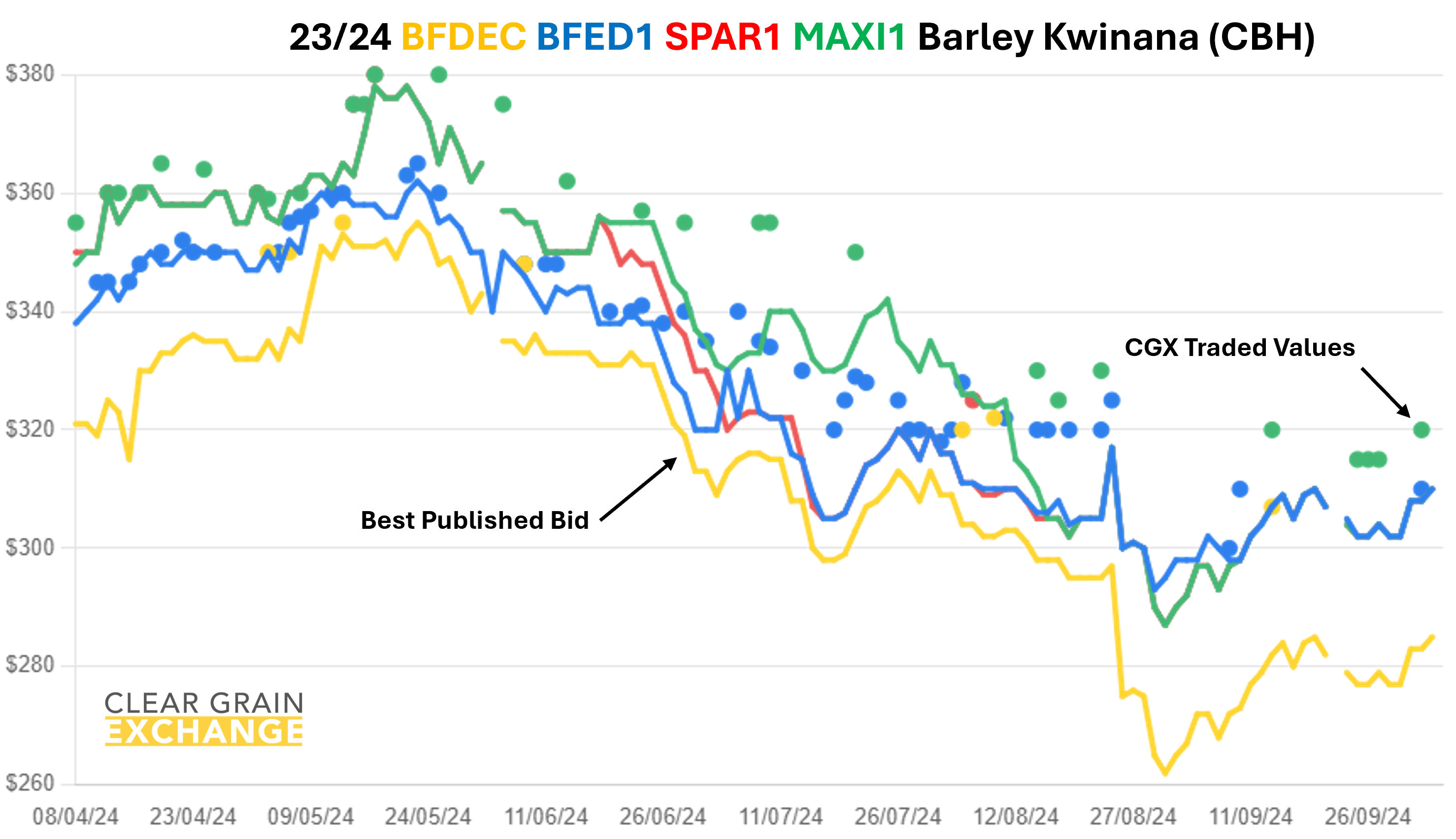 16 buyers purchased barley grades with feed barley trading $324/t track Port Adelaide, $308/t track Melbourne/Geelong, $300/t track Port Kembla and $310/t FIS Kwinana as examples. Some malt barley grades continued to attract better prices than feed.