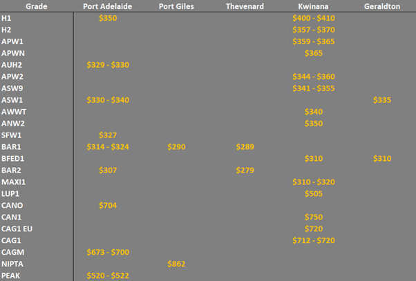 Note: GTA location differentials are used to convert prices to a port equivalent price, actual freight rates can differ particularly in the eastern states. You can offer any grade for sale to create demand.