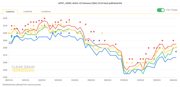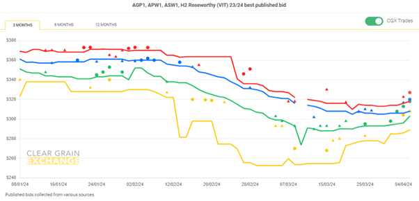 This has seen a general lift in prices of most grades, with traded prices on Clear Grain Exchange regularly better than published bids as a result of buyers meeting growers price expectations when they want to buy the grain.