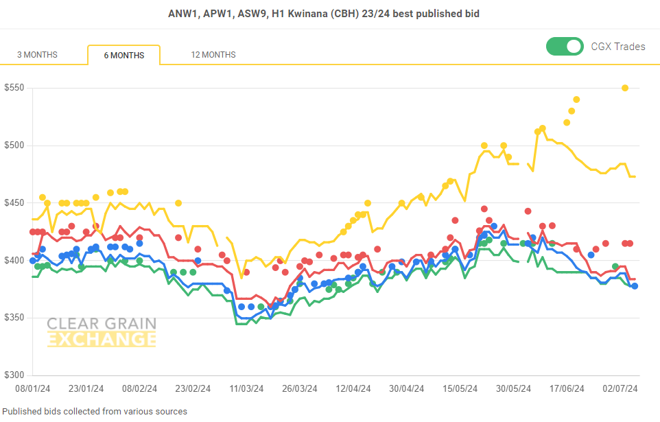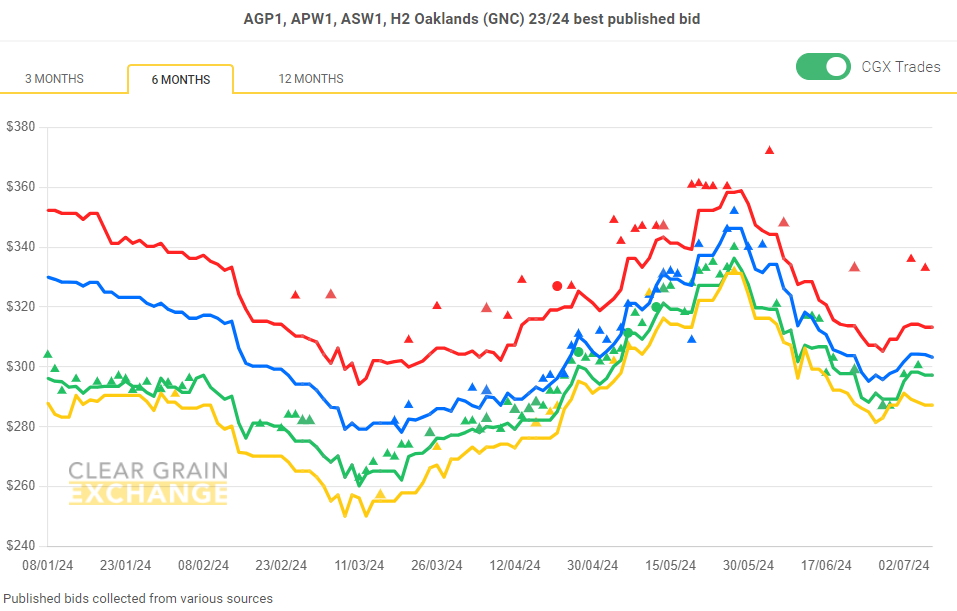 Note: GTA location differentials are used to convert prices to a port equivalent price, actual freight rates can differ particularly in the eastern states. You can offer any grade for sale to create demand.