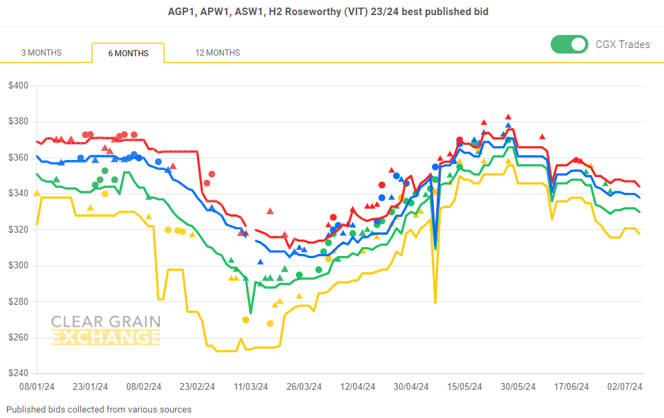 H2 and ASW1 wheat, and SP1 barley made up the majority of volume trading in Victoria, with canola grades making up the balance. H2 traded $374/t Melbourne, ASW1 $334/t Melbourne, and SP1 was $344/t.