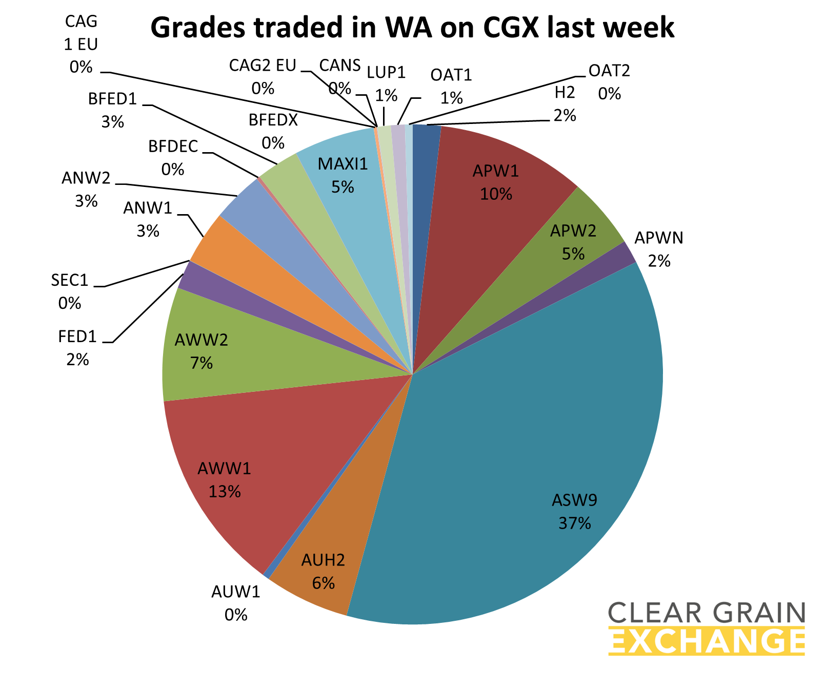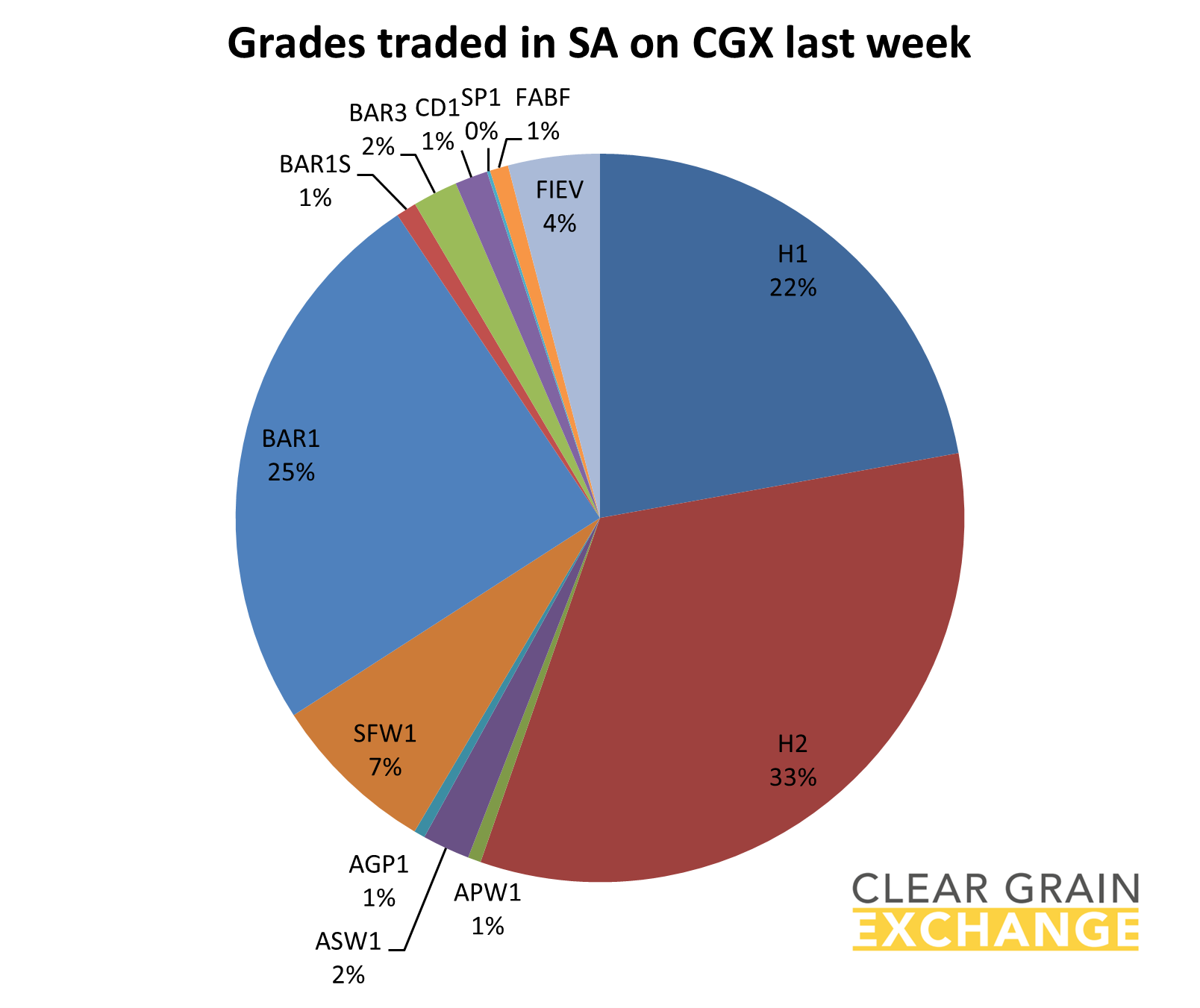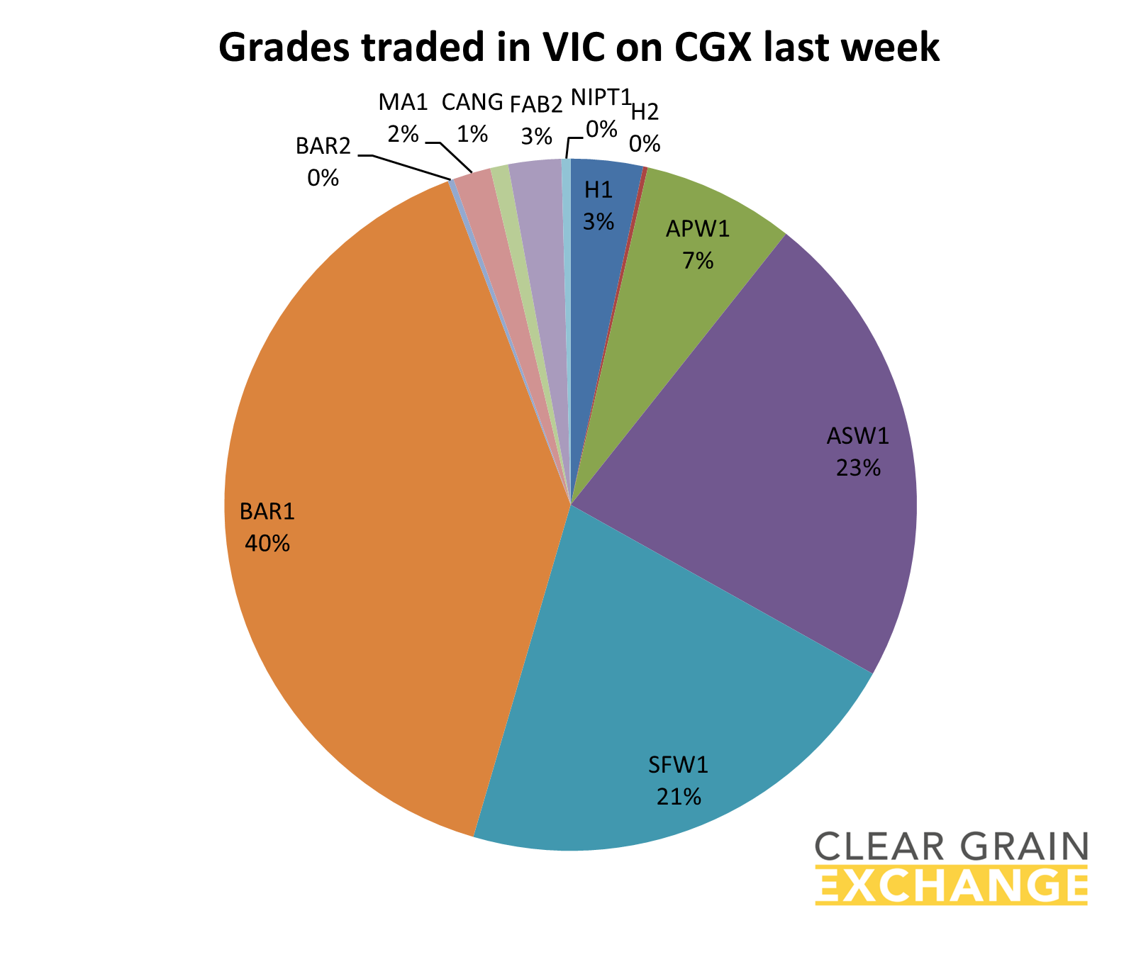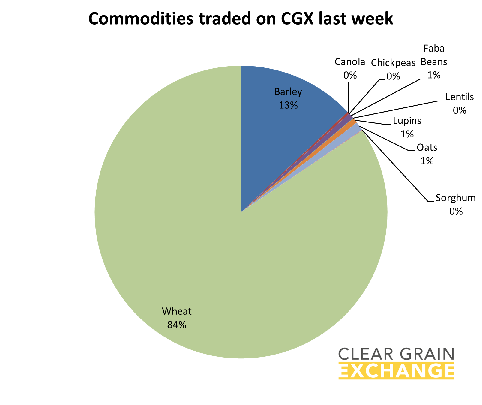 Wheat made up 84% of all grain traded through CGX last week. 20 different wheat grades traded with similar prices being achieved across all grades in many locations.