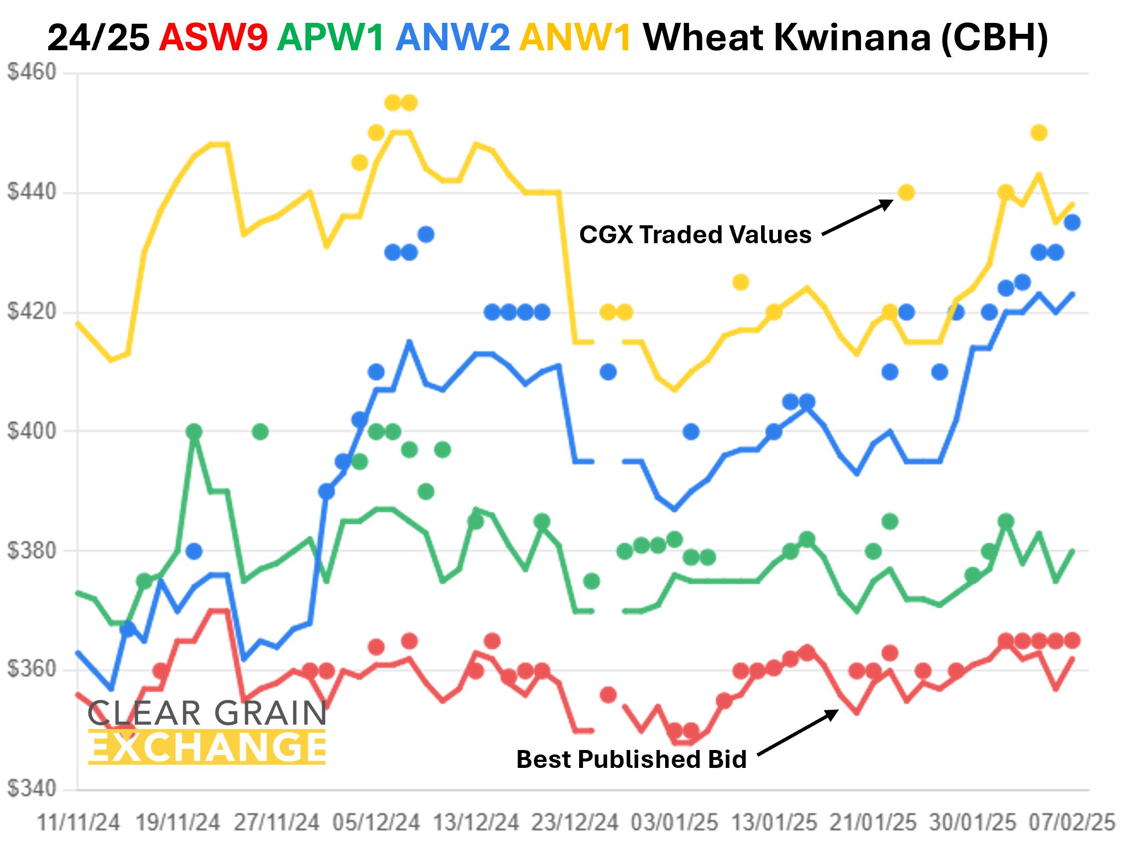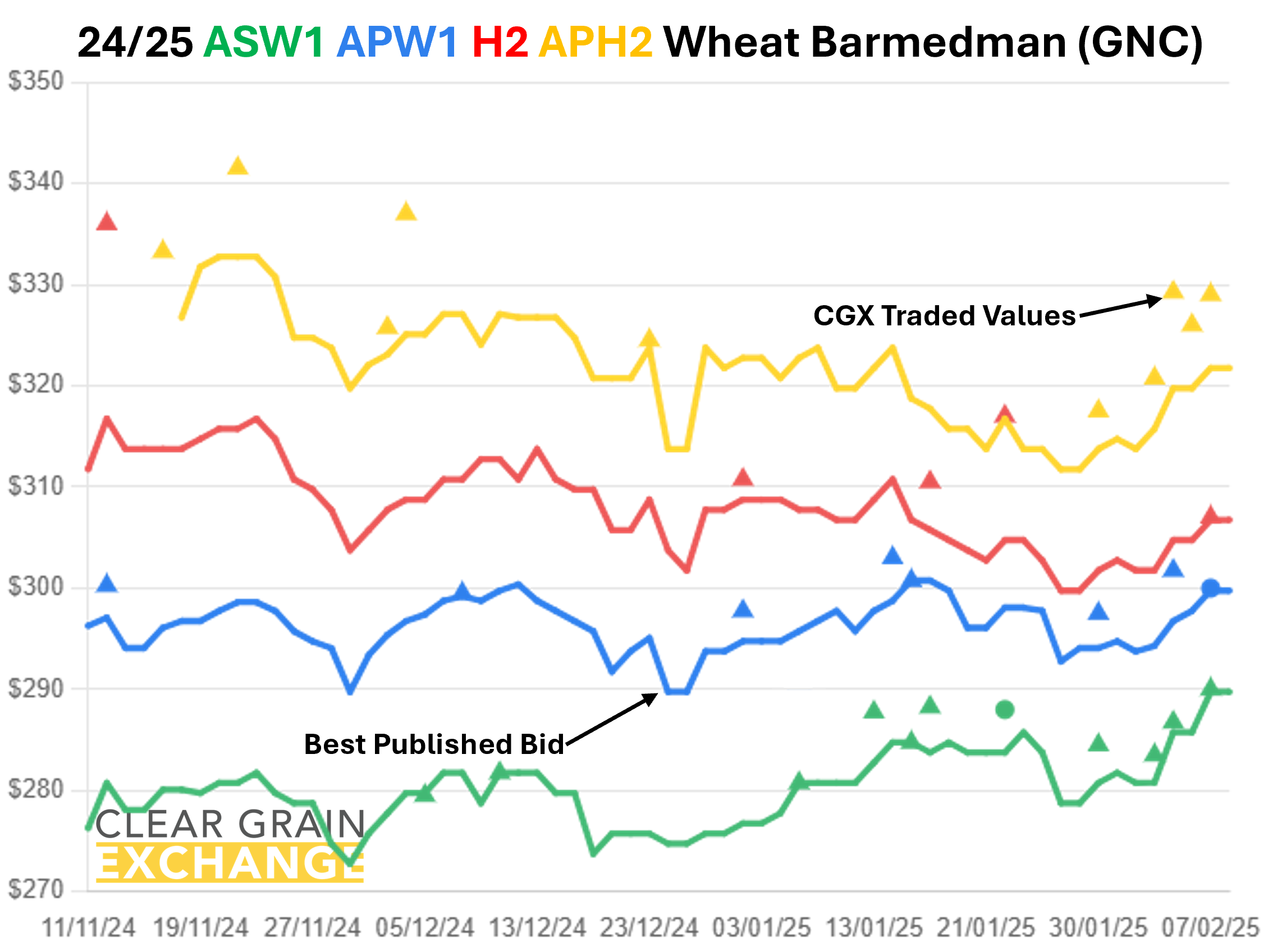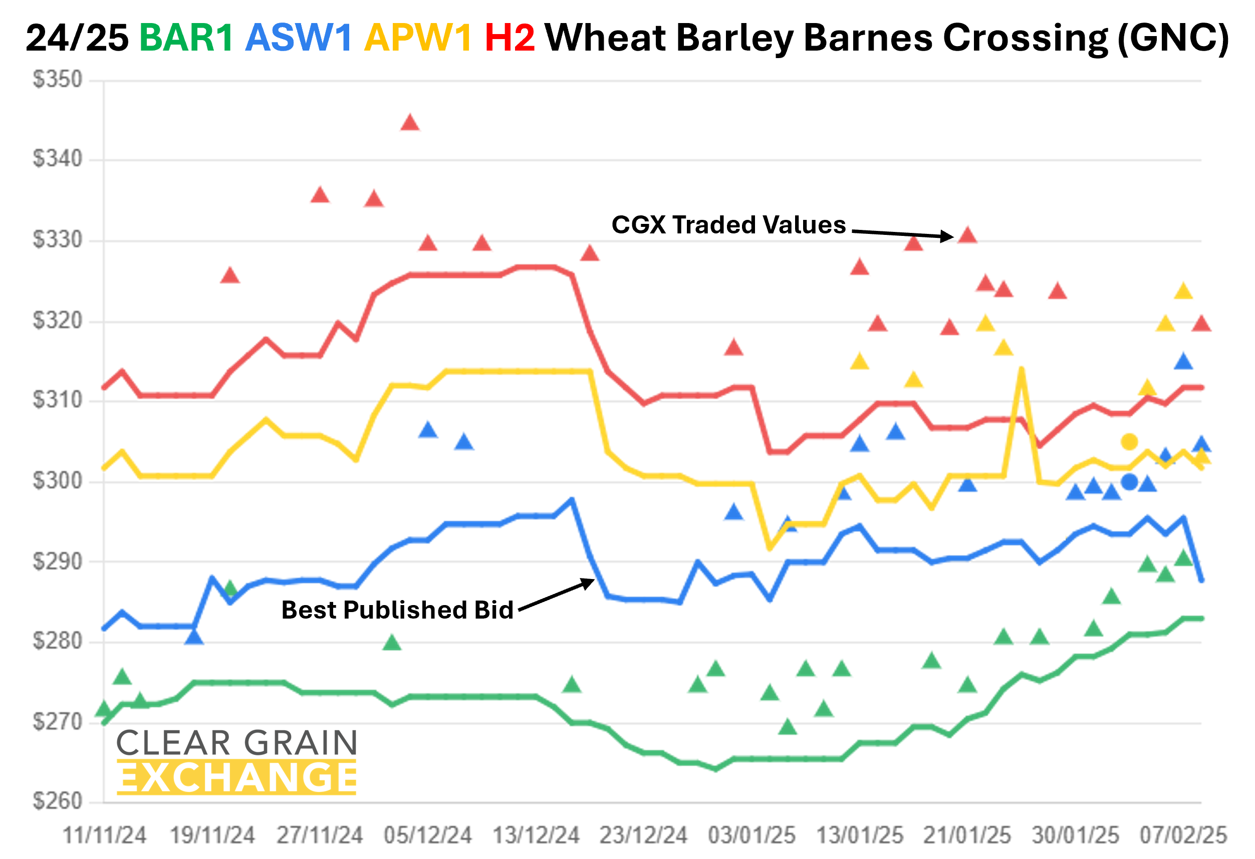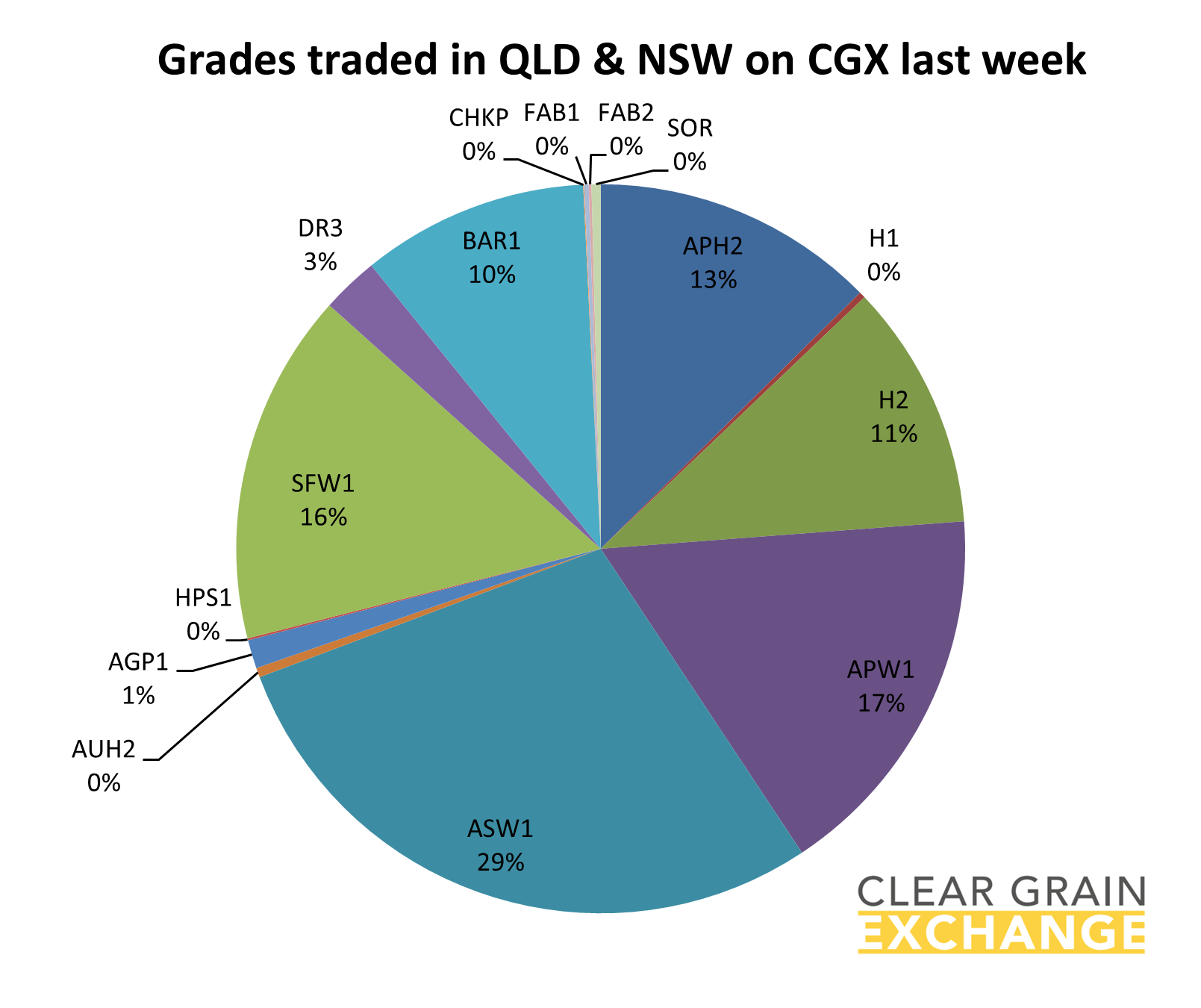 Wheat made up 84% of all grain traded through CGX last week. 20 different wheat grades traded with similar prices being achieved across all grades in many locations.