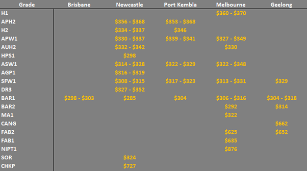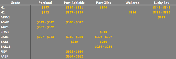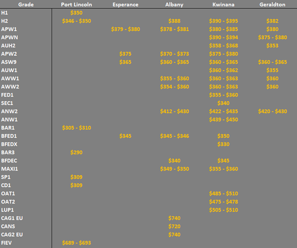 Note: GTA location differentials are used to convert prices to a port equivalent price, actual freight rates can differ particularly in the eastern states. You can offer any grade for sale to create demand.
