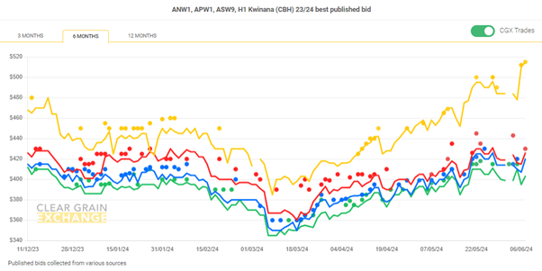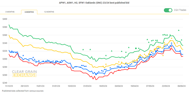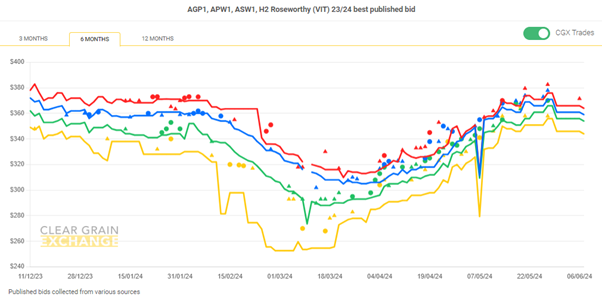 High protein wheat grades continued to attract strong interest and trade at better prices than published bids may indicate. Feed barley in Melbourne and noodle wheats in the west are other examples, there are plenty more.